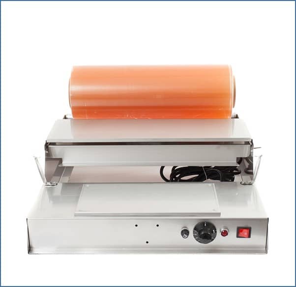מכונת אריזה למגשים (“שרינק”) תוצרת הארץ, איכותית ובעלת אישור מכון תקנים. חיתוך הניילון בחוט.