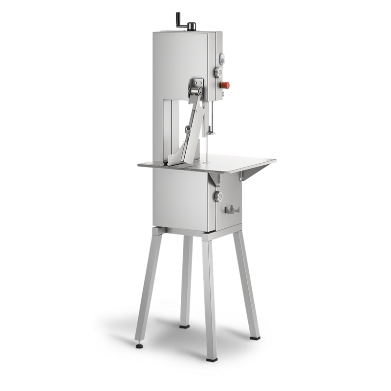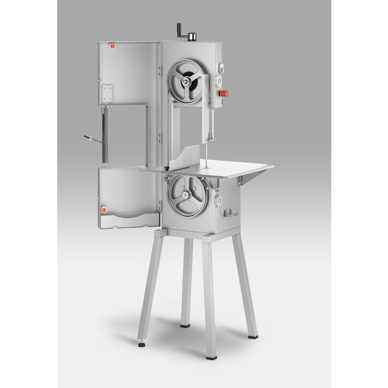 מסור סרט לבשר ריצפתי בינוני, עשוי נירוסטה. גובה חיתוך 302 מ"מ. לשימוש במפעלי בשר ודגים, קצביות וסופרמרקטים. מנגנון מתיחה מתקדם. גלגלי נירוסטה עם מגרעת.